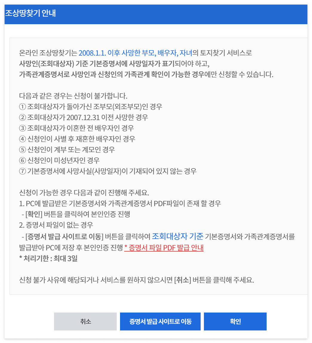 조상땅찾기 사이트에서 본인인증으로 실명확인, 조회 대상자 정보 입력 후 신청할 수 있습니다. 처리기한은 3일입니다.