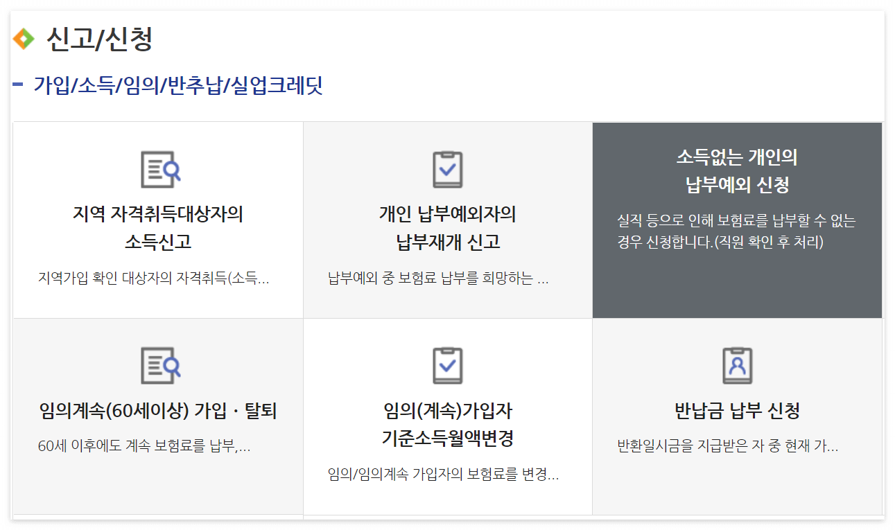 납부예외 신청은 방문신청, 우편, 팩스, 온라인 신청이 가능하며 납부예외 신청을 하였다가 소득이 다시 생기면 신고하여 보험료를 낼 수 있습니다. 납부예외 사유는 아래와 같습니다.