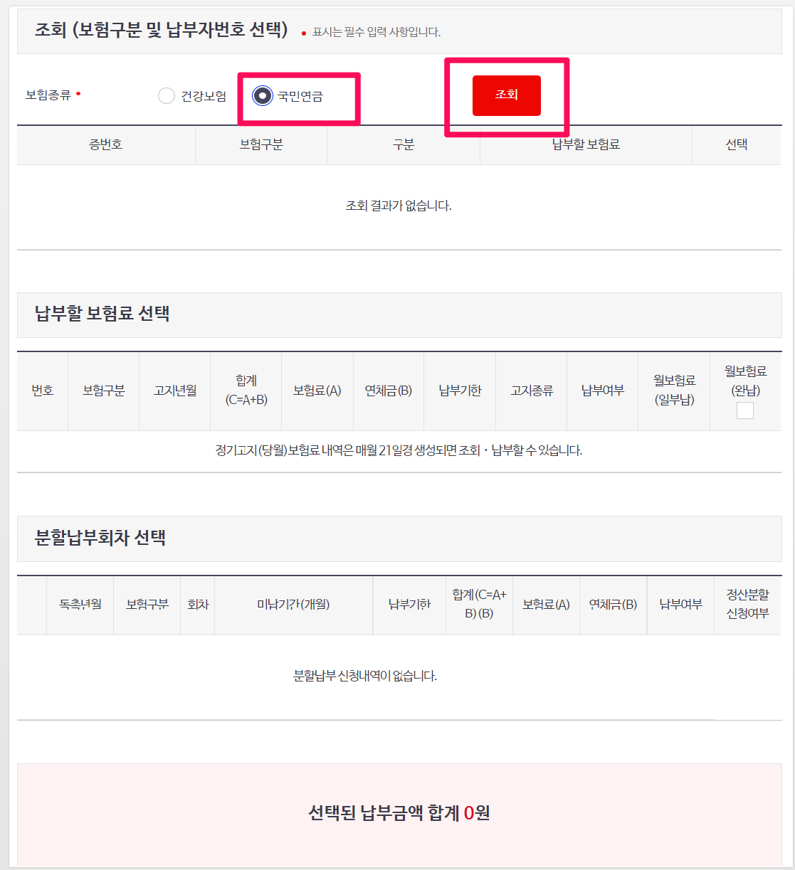 ▲ 국민연금을 선택한 뒤 조회하여 아래에 나오는 미납보험료를 선택하여 납부합니다.
