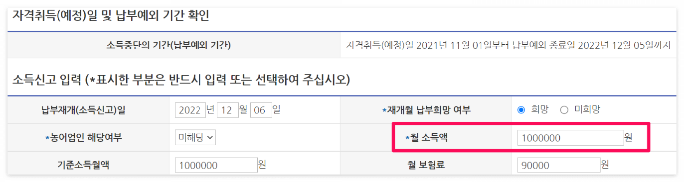▲ 월 소득액에 월 평균 소득액을 입력하고 신청하면 됩니다.