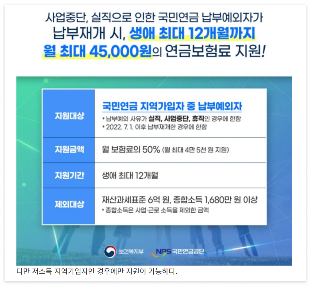 국민연금 납부예외자가 납부재개 시 최대 12개월까지 월 최대 4만 5천원 보험료를 지원합니다.