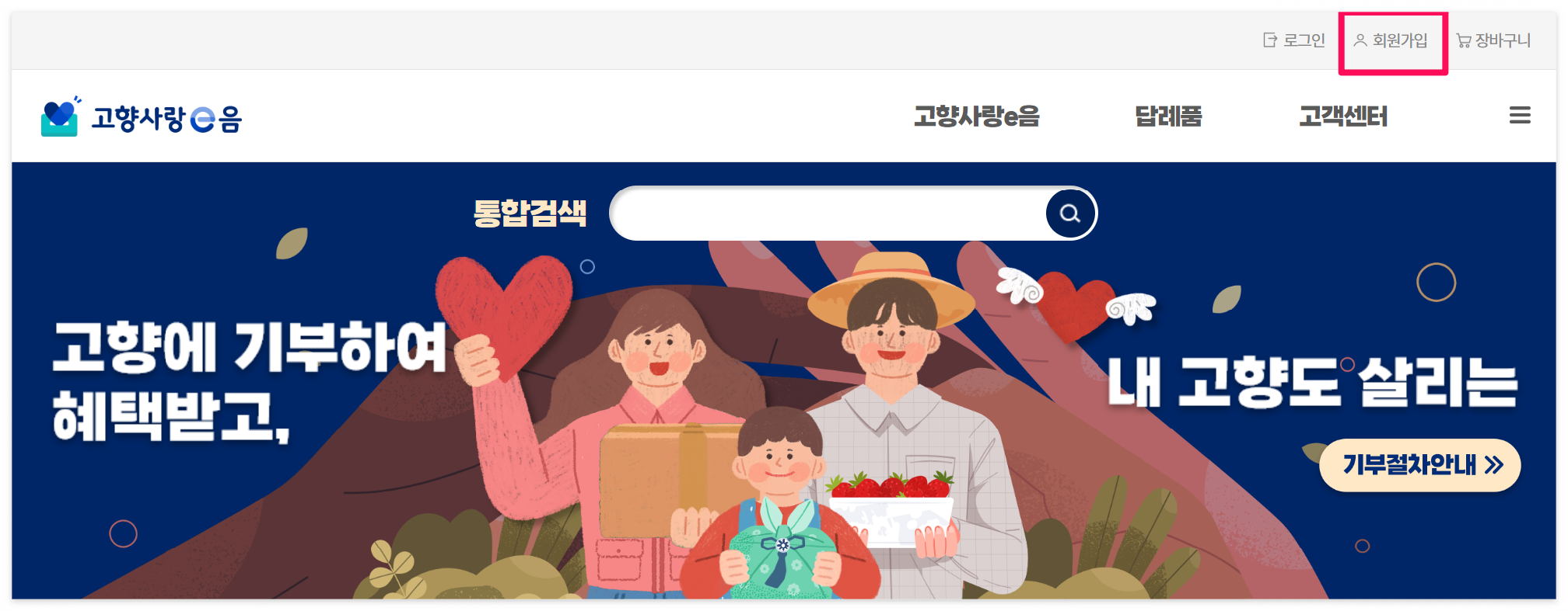 고향사랑e음 사이트에서 회원가입 후 지자체에 기부, 답례품을 선택하면 됩니다. 기부절차를 하나씩 살펴보겠습니다.