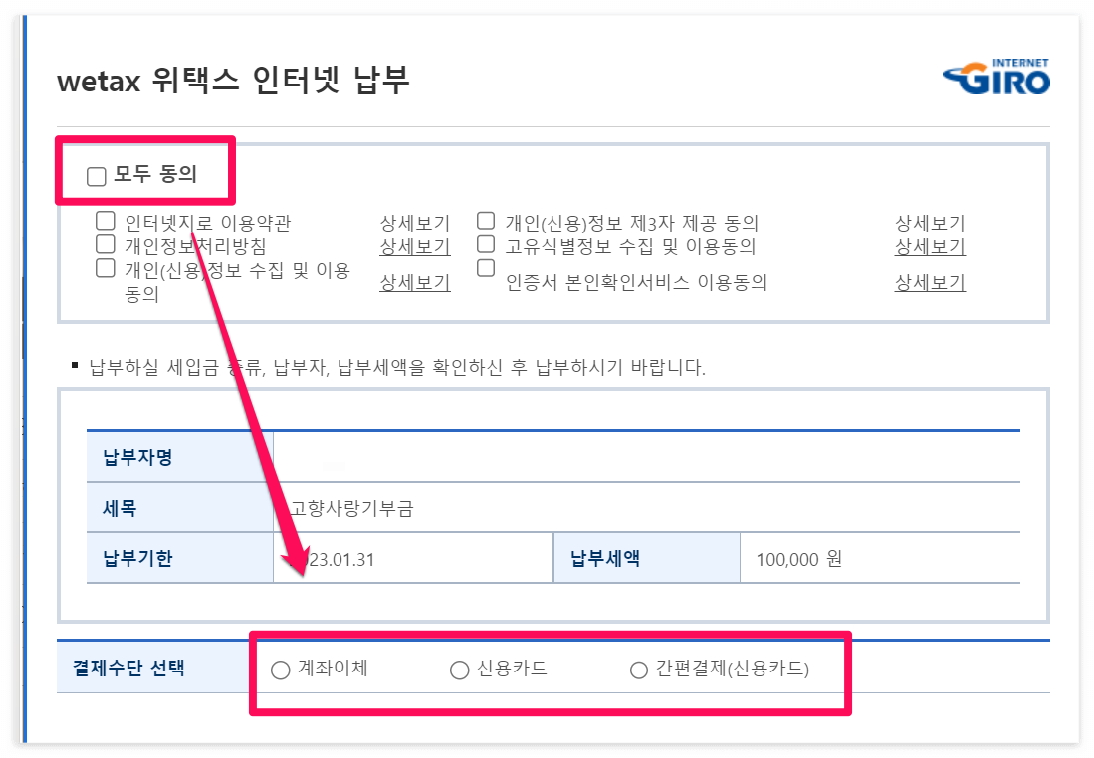 ▲ 서울 외 지역이므로 위택스에서 진행됩니다. 계좌이체, 신용카드, 간편결제 등 원하는 결제수단을 선택하여 결제를 진행합니다.