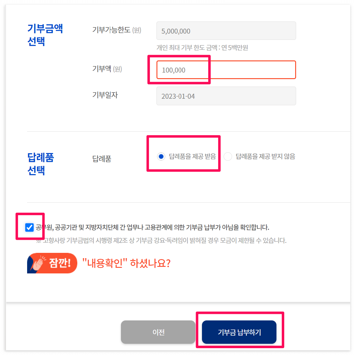 ▲ 기부액을 입력하고 [답례품 제공받음]을 선택합니다. [기부금 납부하기]를 누릅니다.
