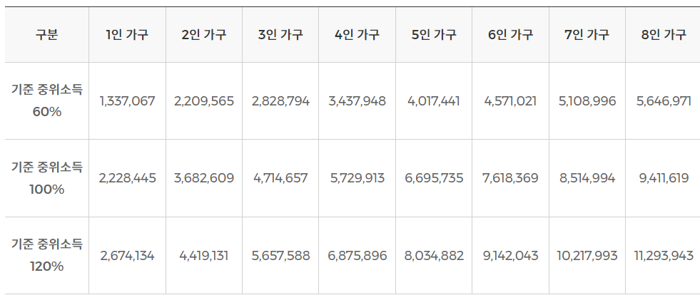 - 2024년 4인가구 중위소득 60%는 3,437,948원, 1인가구 중위소득 60%는 1,337,067원입니다.