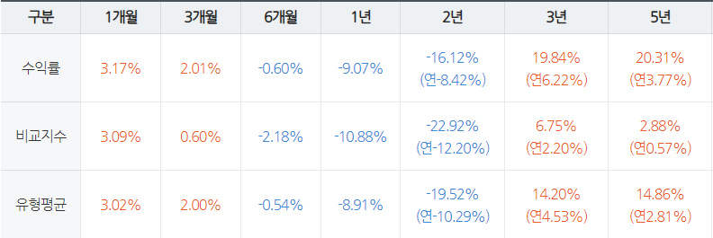 2년 수익률은 마이너스이고 3년 수익률은 19% 정도로 나와있네요.