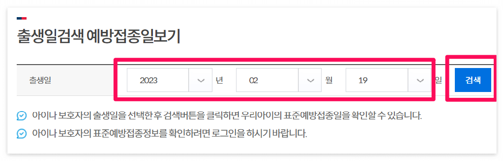 ▼ 아이 생년월일을 입력하여 예방접종 스케줄을 미리 확인해볼 수 있습니다.