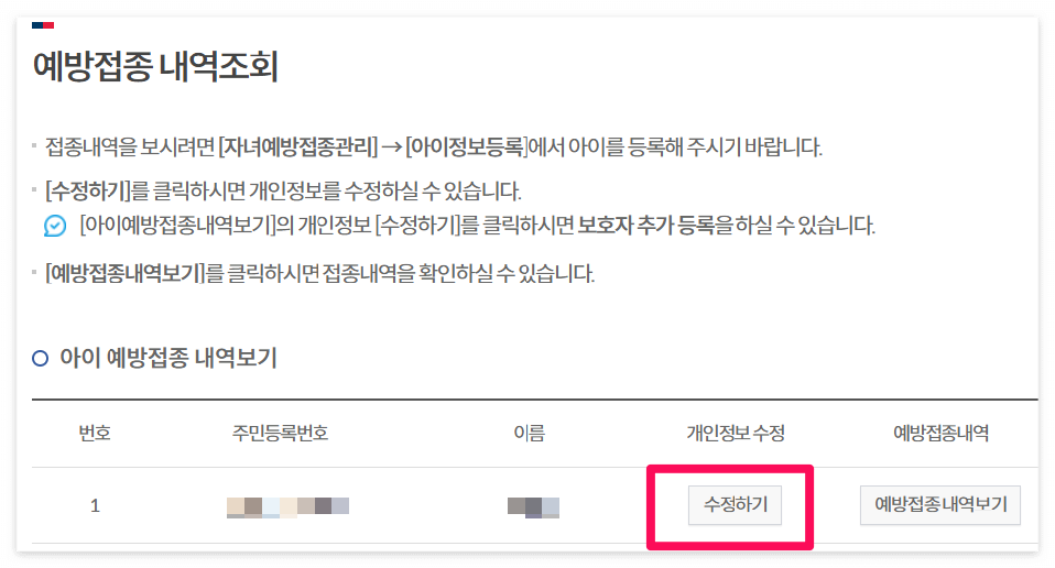 ▼ 등록된 아이 정보에서 개인정보 수정 [수정하기] 선택