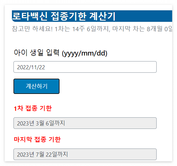 계산기에 생년월일을 입력하여 간단하게 접종기한을 알아볼 수 있습니다.