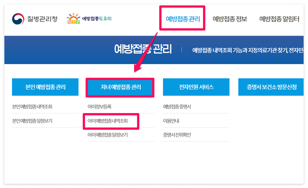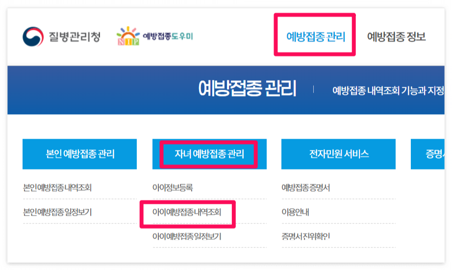 ▼ 예방접종도우미 홈페이지> 예방접종관리 > 자녀 예방접종 관리 > 아이예방접종 내역조회