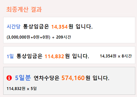 🔻연차수당 계산기를 이용하면 아래와 같이 계산됩니다.