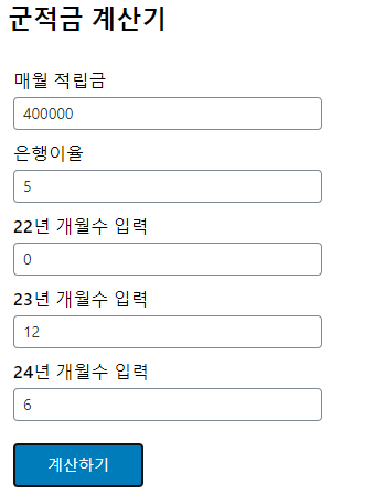 원리금은 간단하게 적금 계산기를 이용하는 것이 편리하지만 아래 군적금 계산기에서 한꺼번에 계산되므로 넘어가겠습니다. 월 적립금, 개월수, 이율을 가지고 만기 적금액을 계산할 수 있습니다.