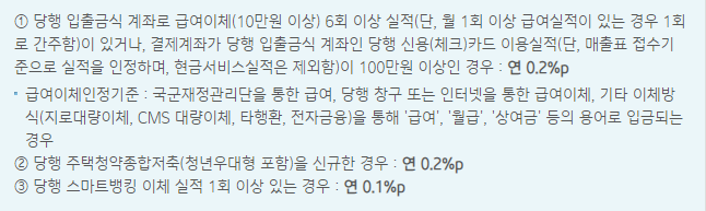 아래와 같이 은행에 따라 우대 금리를 제공하므로 본인의 금리는 조금씩 다를 수 있으며 해당 은행 상품 이율에 나라에서 1% 이자지원금을 더하여 계산합니다.