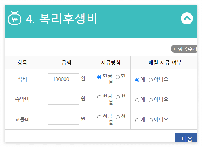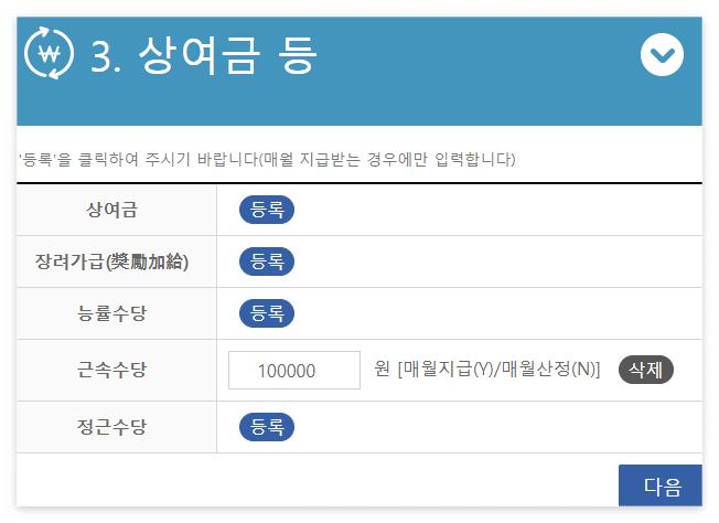매월 지급되는 정기상여금, 장려가급, 능률수당, 근속수당, 정근수당을 입력합니다. 예시와 같이 근속수당에 10만원을 입력했습니다.