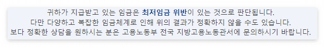 앞서 210만원이지만 최저임금에 산입되지 않는 금액을 빼면 198만원으로 최저임금 위반이라고 계산했었는데요. 고용노동부 계산기 결과에서도 마찬가지로 최저임금 위반으로 계산됩니다.