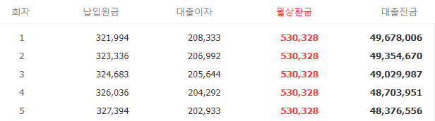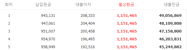 [예시] 5천만원 4년 원리금 분할상환 (이율 5%)