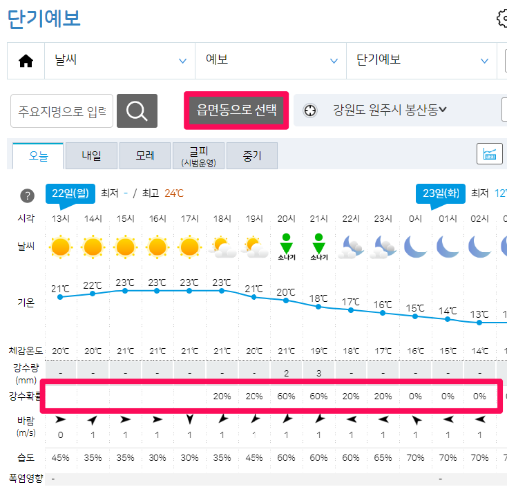 내가 사는 지역이나 특정 지역의 시간대별 강수확률이 궁금하다면 날씨누리 단기예보에서 확인 가능합니다.