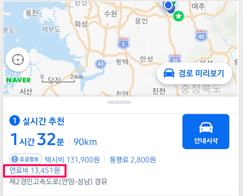 총 1시간 32분이 소요되고 약 90km 거리의 연료비가 13,451원으로 나옵니다.