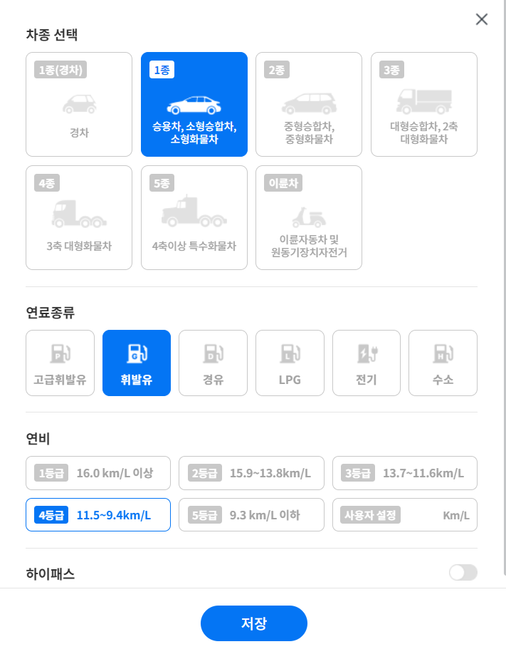 - 연료가 휘발유인지 경유인지 선택합니다.
