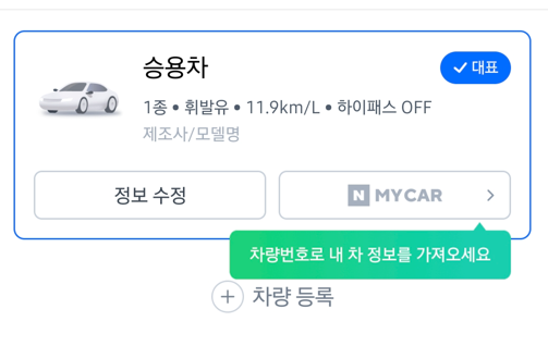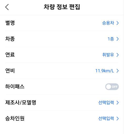 5. 내 차에 맞게 정보를 수정합니다. 차종, 연료, 연비 등을 수정합니다. pc와 다르게 앱에서는 연비를 숫자로 입력합니다.