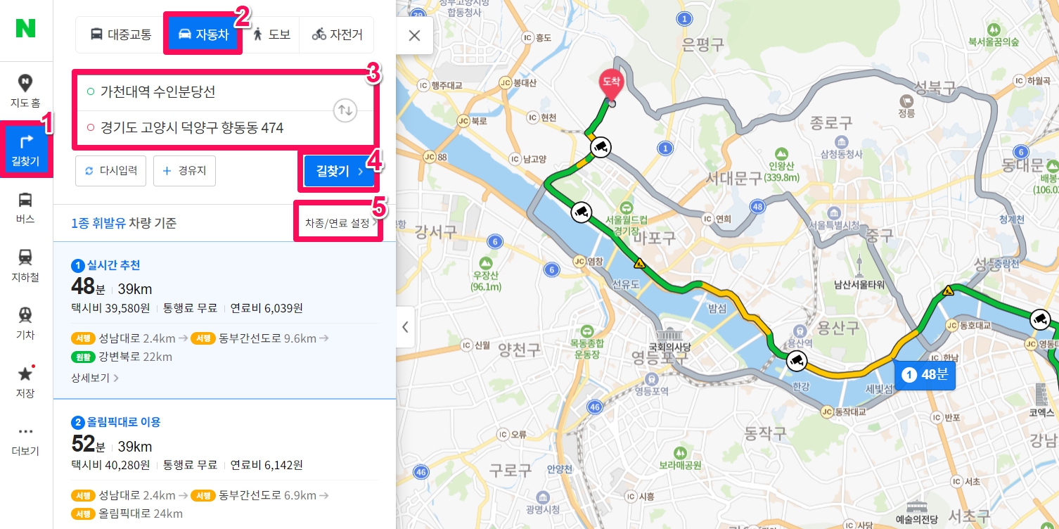 1) 길찾기 선택 2) 자동차 3) 출발지, 목적지 입력 후 4) 길찾기를 누릅니다. 하단에 걸리는 시간과 함께 연료비가 나오는데 이 때 내 차에 맞게 조건을 바꾸기 위해 5) 차종/연료 설정을 누릅니다.