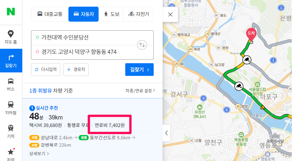 아래에서 해당 경로로 주행했을 때의 연료비를 확인할 수 있습니다. 39km에 연료비는 7400원 정도로 나옵니다.