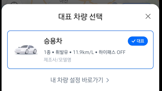 2. 실행한 뒤 경로를 검색합니다. 경로 아래에서 자동차 모양을 선택합니다. 내 차에 맞게 조건을 바꾸기 위해 하단에 [승용차>] 버튼을 선택합니다.