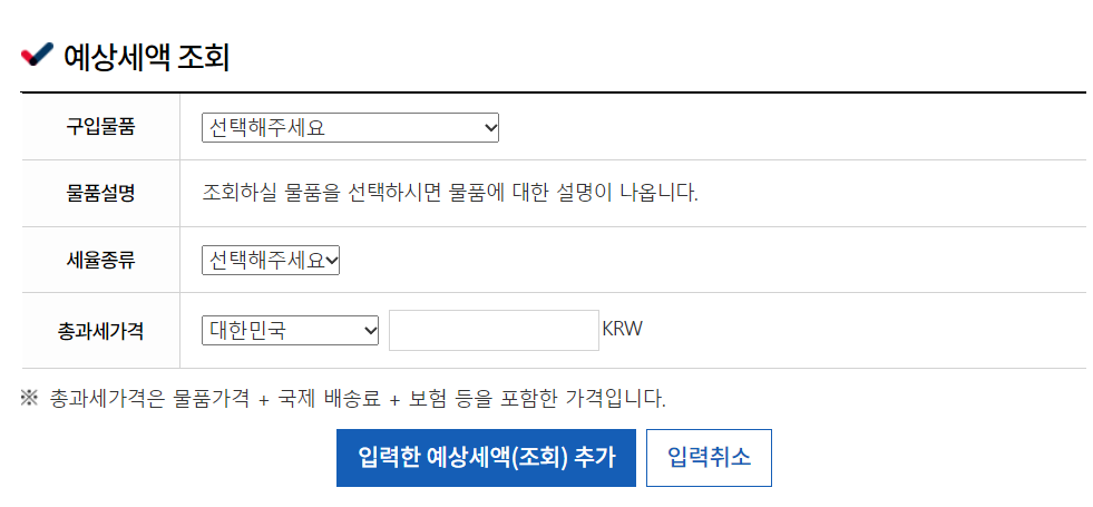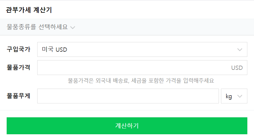 2. [물품종류를 선택하세요]를 눌러 물품의 대분류와 소분류를 선택하고 구입국가와 물품의 가격과 무게를 입력하면 자동으로 계산해줍니다.