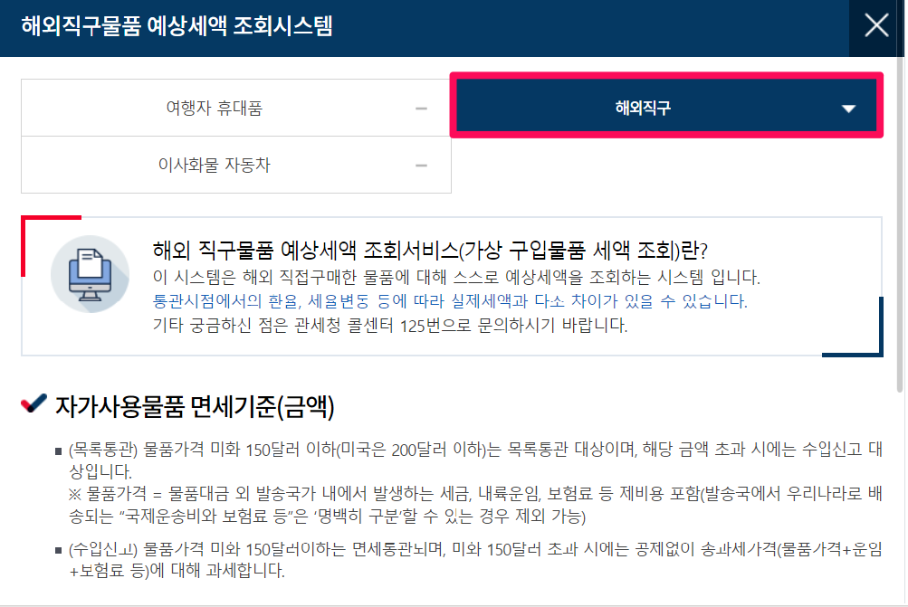 1. 예상세액 조회시스템에서 해외직구를 선택합니다.
