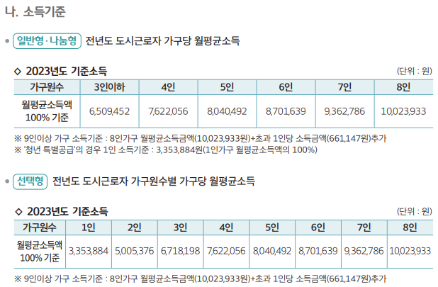 공급유형에 따라 소득, 자산 조건이 달라집니다.