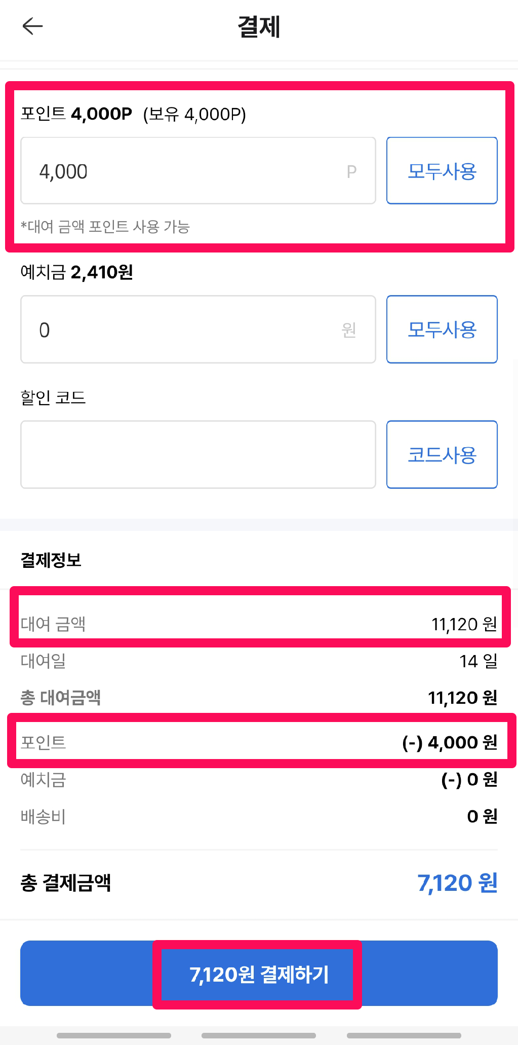 보유 4천점 포인트를 사용하니 대여료가 11,120원에서 7,120원으로 확 줄었네요. 왔다갔다 안해도 되고 집에서 신간을 바로 볼 수 있으니 대만족입니다.