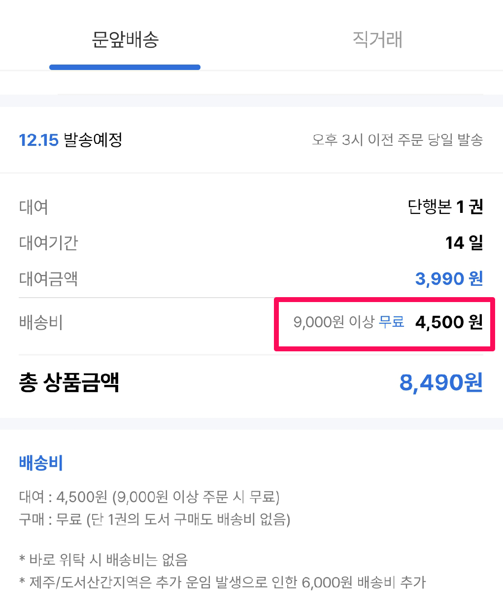 책을 한권만 선택했더니 배송비가 4500원이 붙었습니다. 9천원 이상 주문 시 무료니까 꼭 9천원을 맞추는 게 좋습니다.
