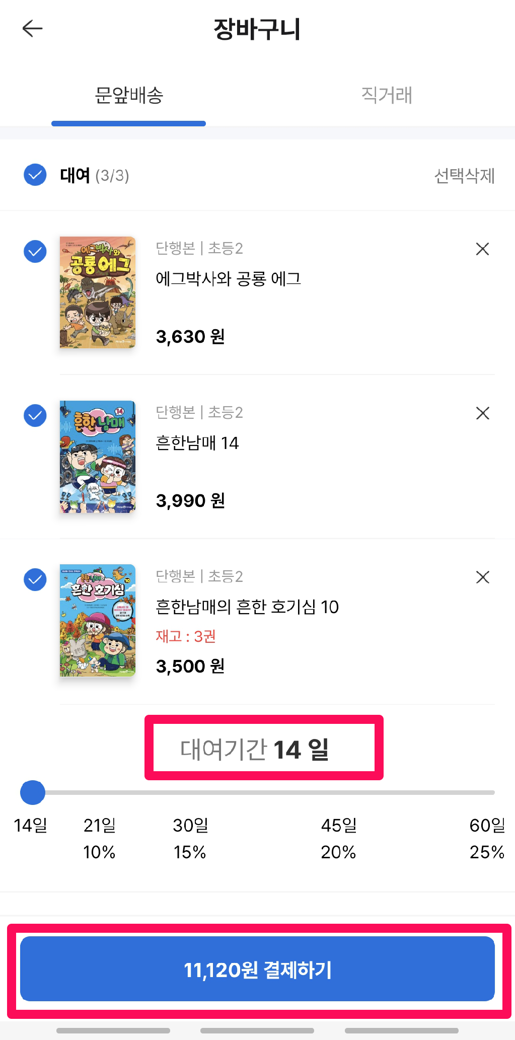 9천원을 넘겨야 하니 3권을 모았습니다. 대여일을 선택할 수 있는데요. 기본은 14일입니다. 길어질수록 가격도 올라갑니다. 만화는 아이들이 빨리 보니 14일이면 충분할 것 같아요.