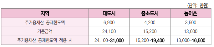 재산합계액은 대도시 2억 4천 1백만원, 중소도시 1억 5천 2백만원, 농어촌 1억 3천만원 이하로 주거용 재산공제 적용 시 대도시 3억 1천만원, 중소도시 1억 9천 4백만원, 농어촌 1억 6천 5백만원 이하입니다.