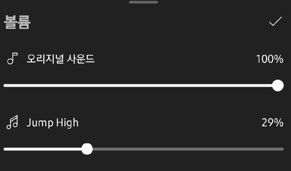 4. 음원 우측에 나오는 아이콘을 선택하면 음량을 조절할 수 있습니다. 조절하지 않으면 오리지널 소리는 사라지고 노래소리만 들리므로 반드시 수정해야 합니다.