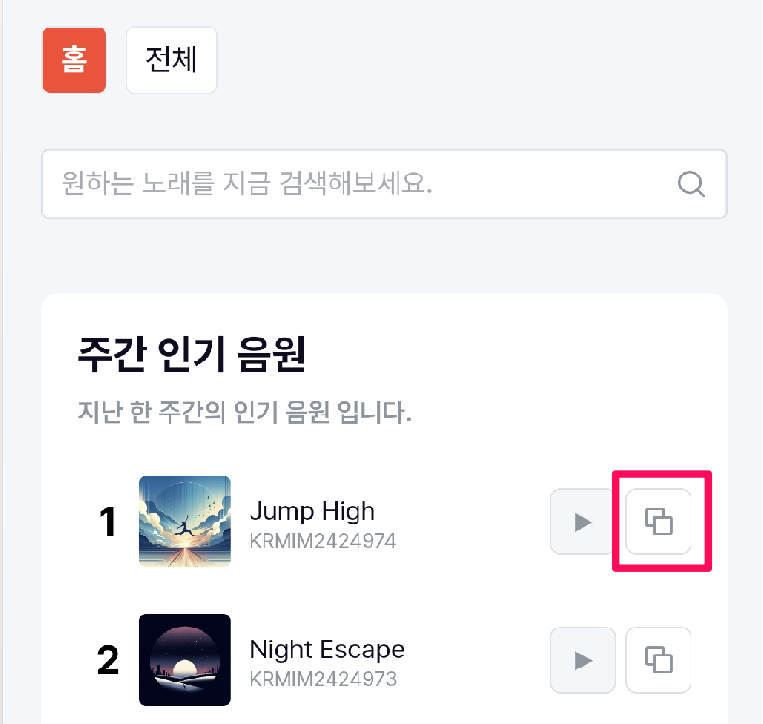 3. 검색창에 짤스튜디오에서 확인한 음원 코드를 복사한 뒤 유튜브 음원 검색창에 코드를 입력하여 검색합니다. 짤스튜디오 앱 하단에 [음원리스트]를 누르면 확인이 가능합니다.