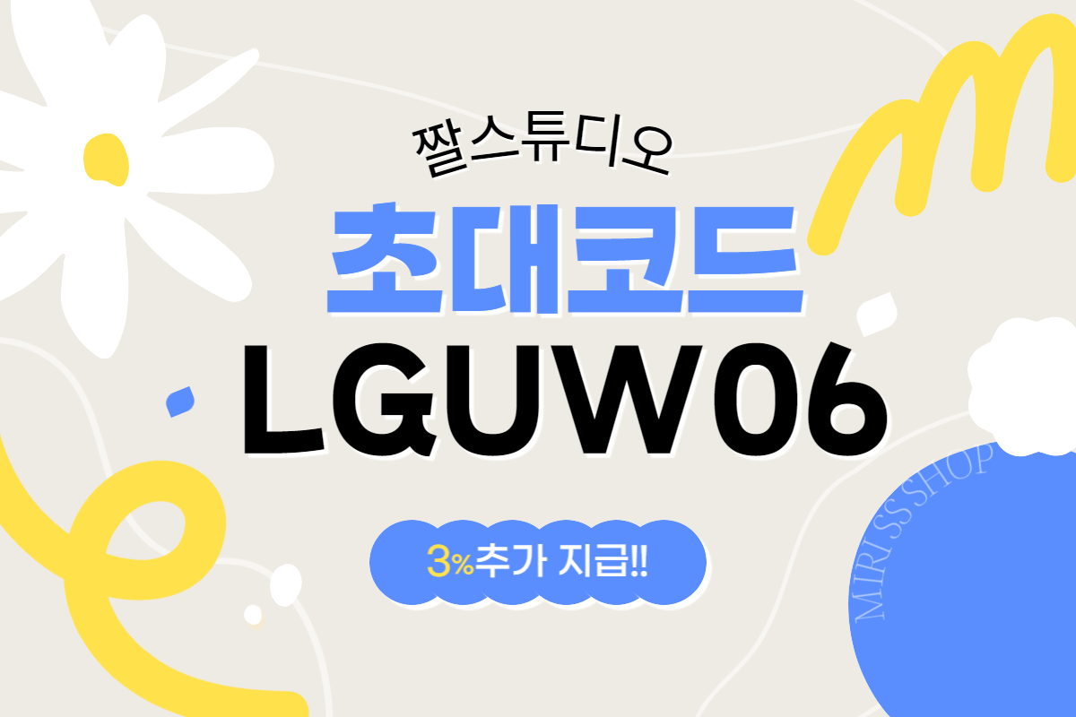 짤스튜디오 가입할 때 하단에 보면 짤스튜디오 초대코드를 입력할 수 있는데요. LGUW06 (끝 두 자리는 숫자 0, 6 입니다!) 입력하면 3% 더 받을 수 있습니다. 😊 꼭 입력하시고 같이 3% 더 받아요! 😊