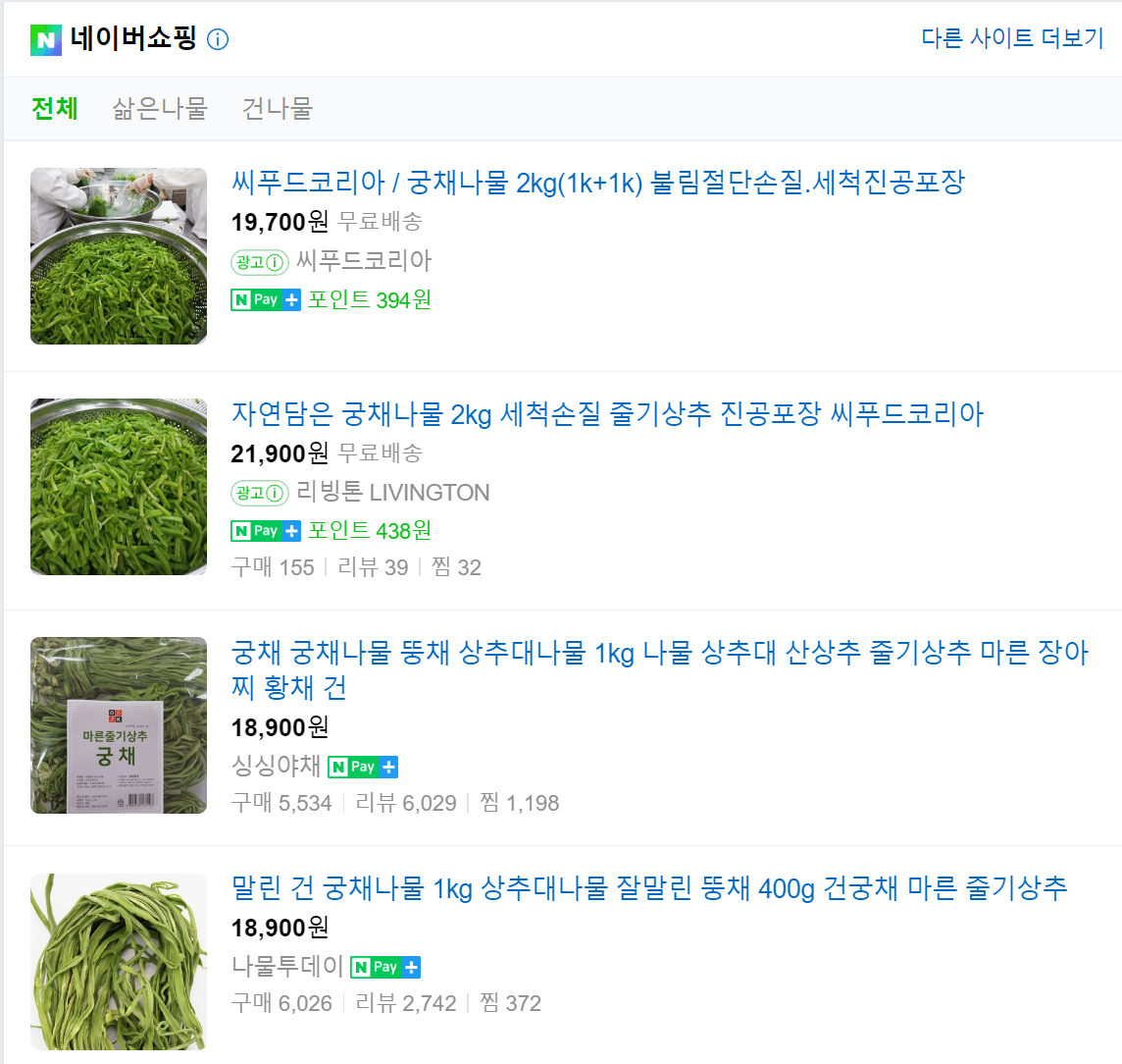 네이버에서 '궁채나물'로 검색하고 아래로 내려오면 여러 판매처를 확인할 수 있습니다.
